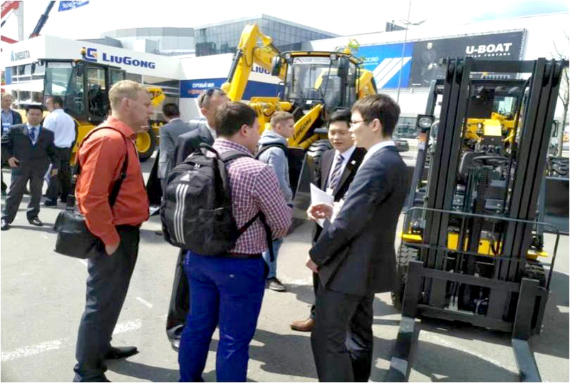 柳工俄羅斯經(jīng)銷商在展會中,展出了公司全新H系列裝載機(jī)及俄語區(qū)銷售的主流工程機(jī)械產(chǎn)品。包括CLG835H和CLG856H型號的2臺裝載機(jī),1臺CLG920E挖掘機(jī),1臺CLG4215平地機(jī),1臺CLG614H壓路機(jī),2臺叉車以及1臺TD-15M銳斯塔推土機(jī)。